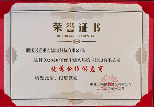 會(huì)上,天工集團(tuán)旗下綠色建筑構(gòu)件工業(yè)化生產(chǎn)基地——浙江天壹重石建設(shè)科技有限公司喜獲“2020年度中建八局第三建設(shè)有限公司優(yōu)秀合作供應(yīng)商”獎(jiǎng)。